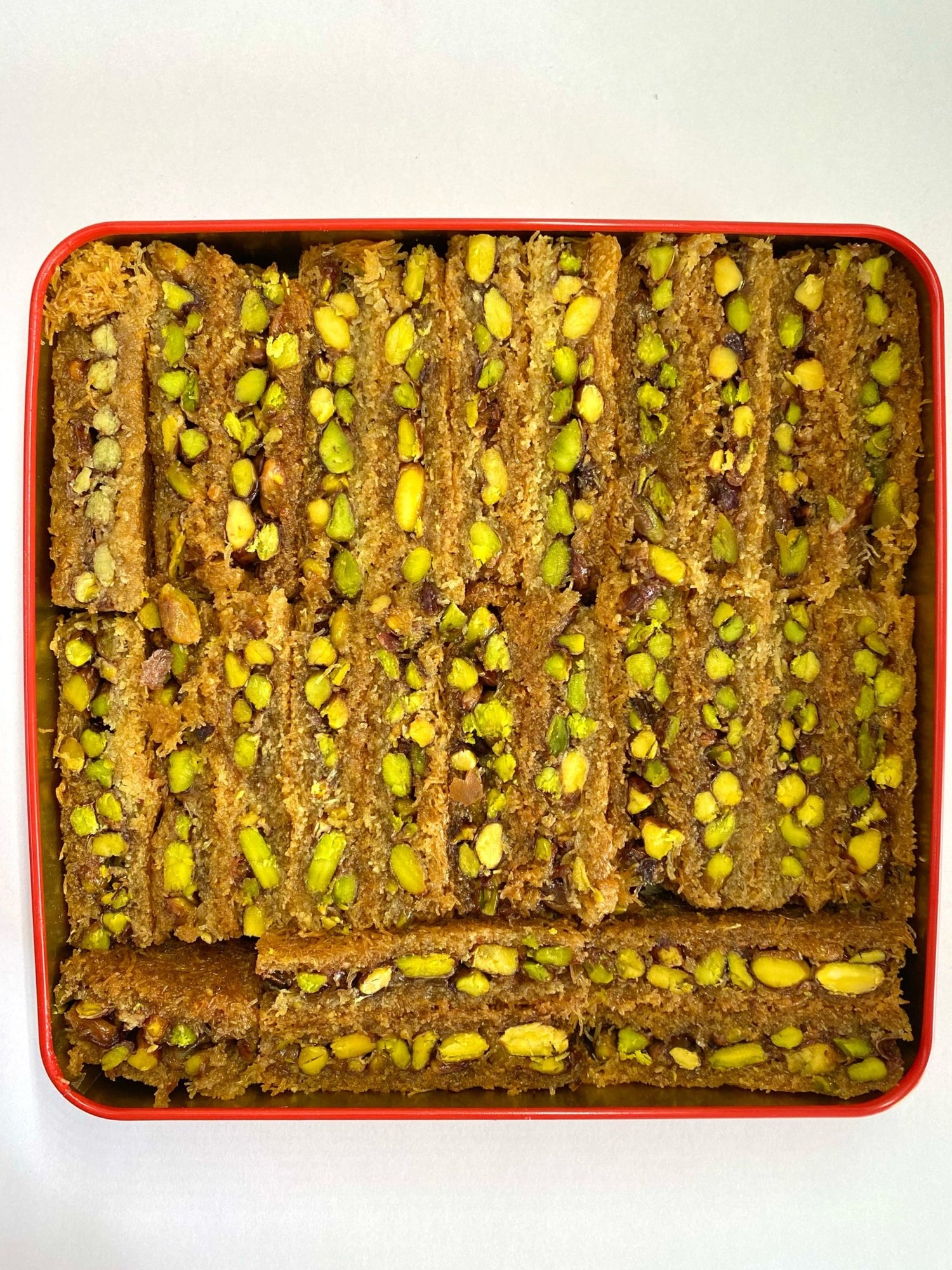 Ingredients: water, wheat flour, sugar, pistachios, hydrogenated vegetable oil, clarified butter, lemon juice