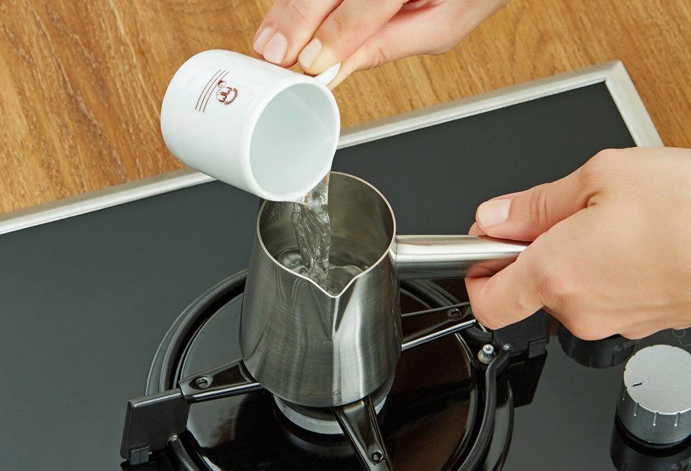 Use 5-6 grams (1.5 teaspoons) of coffee per 65ml of water. Add the water into a pot and set it to low heat. Add the coffee and your choice amount of sugar to the water and mix them slowly. Once the coffee comes to a bubble over time, serve the froth into your cup(s). Then boil the remaining coffee some more, and pour the remainder into your cup(s).